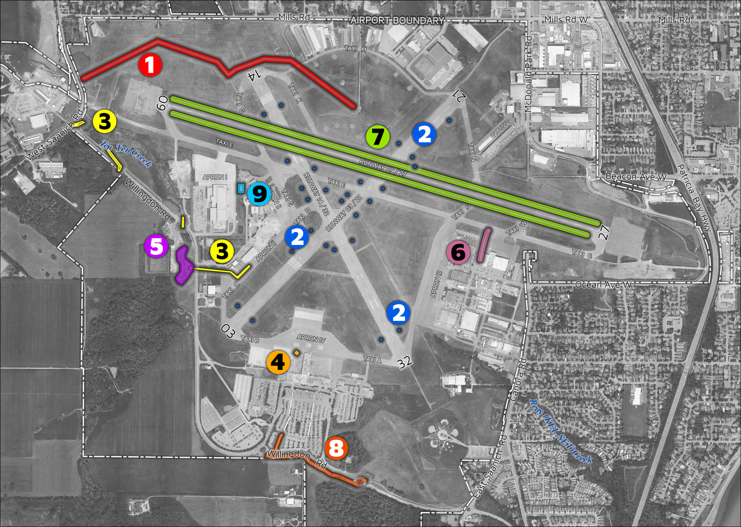 Overview: Portions of the stormwater network, some more than 70 years old, are being replaced to maintain reliable drainage. This work includes new pipes between Apron IV and ȾEṈTEN (Tenten Creek) as well as along Willingdon Road and West Saanich Road.